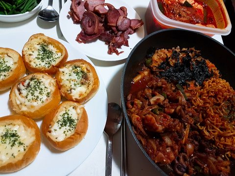 매운쭈꾸미볶음과 오리고기 그리고 모닝빵 속을 파내고 바질페스토랑 옥수수 치즈채워넣은 피자빵이에요. 사실 조합을 알수없지만....ㅋㅋㅋㅋ 맛있게 먹었어요!