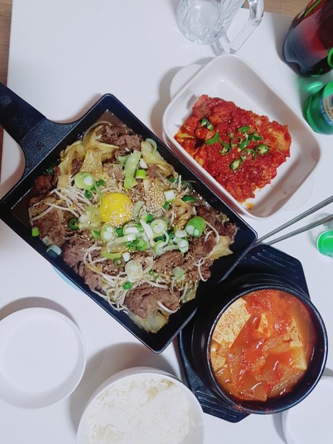 이자카야에서 많이 먹는 차돌숙주볶음에 날계란 하나 톡 터뜨리고 김치찌개랑 같이 먹었어요.