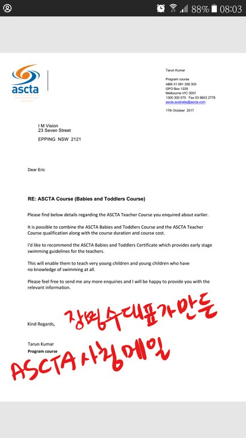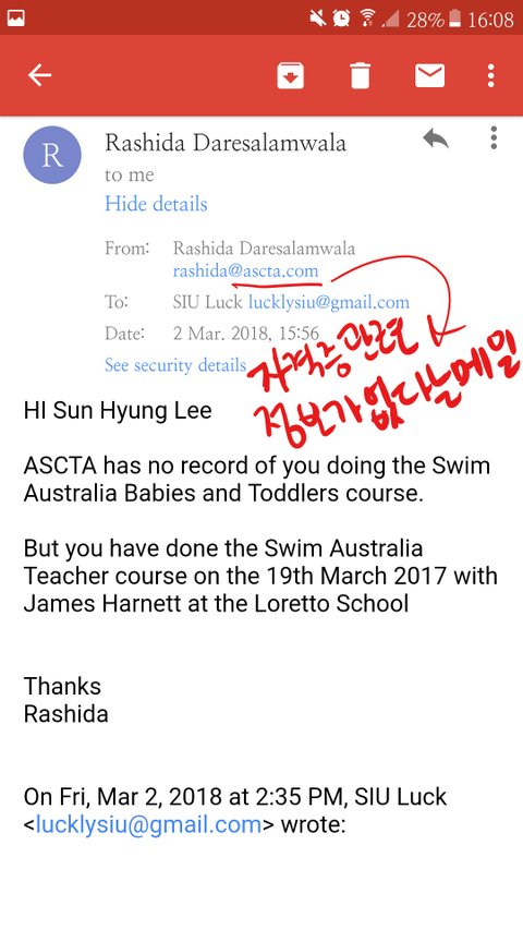 자격증을 받지 못했던 이유로 호주한인수영교실 대표가 했던 말은 트레이닝을 더 받아야 한다, 집에 두고 왔다, 이사를 가서 찾지 못하겠다 등이였습니다. 결국 비자 만료 이틀을 앞둔 3월2일 경 직접 수영자격증발급업체에 전화를 해보니 제 자격증이 아예 없다는 청천벽력같은 소리를 듣게 됩니다. 저와 함께 정부지원으로 갔던 친구들은 6명이였습니다. 2주간의 과정을 진행하는데 공공기관에서 천불을 업체에 지불했는데, 한 단명의 자격증 정보도 없었습니다.
