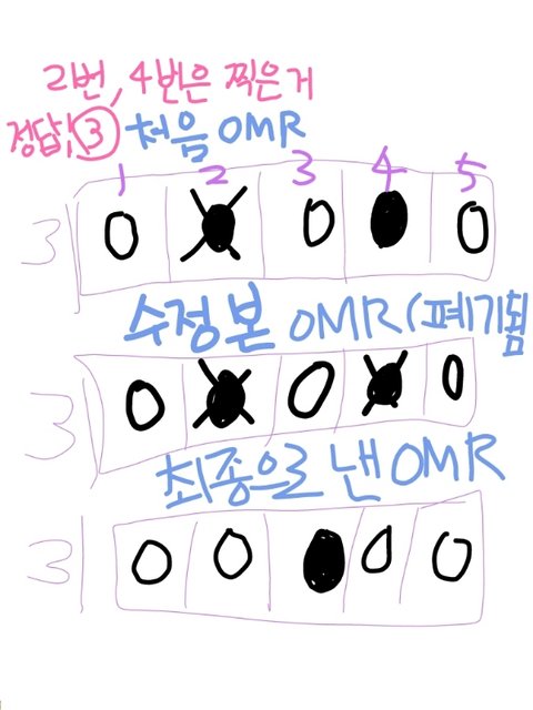 제가원래 2번마킹했다가 ×치고4번에 마킹을 해놨는데(둘다 최애 생일로 찍었던거) 답이 3번인걸 오엠알 고치기전에 안거죠...