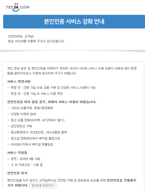 혹시 모르니까 미리 예사 본인인증 해둬! 최근에 메일로 날아왔더라