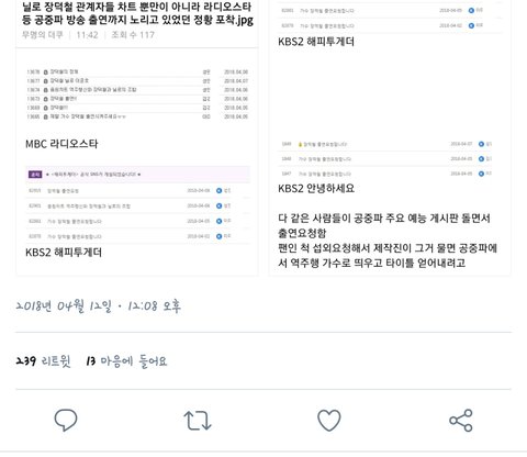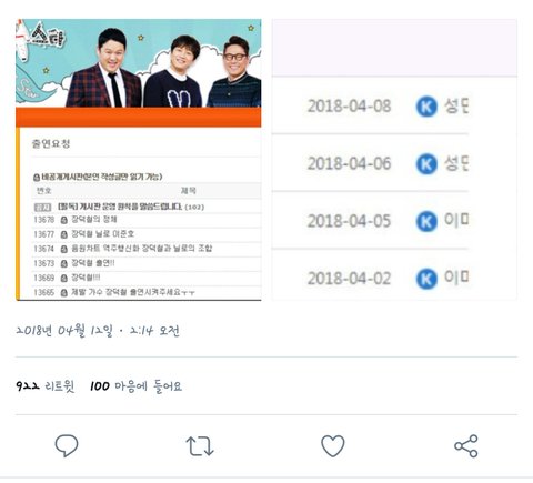 1. 동일한 사람(성XX)이 동일한 날짜(4/6,7,8)에 여러 방송사(MBC,KBS,SBS) 홈페이지에 글을 남김 – 팬카페에 글쓰기에 이어 제가 쉽게 할 수 있는 활동은 출연요청 게시물을 남기는 것입니다. 출연요청 게시물을 남겨보신 분들은 아실 거라 생각합니다. 방법은 어렵지 않고 그저 각 방송국 홈페이지에 로그인을 한 후 프로그램 게시판에 글을 작성하면 됩니다. 저는 MBC 라디오스타, 복면가왕 KBS 안녕하세요, 해피투게더, 불후의 명곡, SBS 런닝맨에 출연 요청글을 남겼습니다. 총 3일을 남기고 그 후로 작성하지 않은 이유는 계속 같은 페이지에 제 글이 있어서 다음 주쯤 남기면 알맞겠다 생각하였고 사실 귀찮은 것도 없진 않았습니다. (장덕철 출연요청을 한 다른 분들 역시 장덕철의 팬이자 팬카페 회원이 맞고 출연 요청글 게시 후 팬카페에 말씀해 주시는 부분이라 저도 알고 있습니다. 제가 더 언급할 수는 없는 점 이해해주시기 바랍니다.)