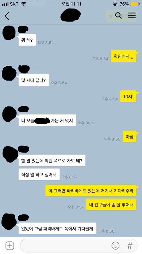본문) 어제 이렇게 톡 하고 짝남한테 고백 받음 파리바게트는 학원 건물 반대편 쯤인데 친구들 다 집 방향 그 쪽 아니라 거기서 만나려고 했는데 (평소에 이 애 저 애 다 엮어서 짝남 기분 나쁠까봐) 학원 1층에서 기다리더라 짝남이 OO이 좀 데려갈게 이러는데 친구들이 추임새 넣고.. 짝남은 신경 안 쓰고 내 손 잡고 근처 놀이터 가서 좋아해 OOO 우리 사귀자 이러는 거야... 근데 순간 나 완전 즉각대답 함 ㅋㅋㅋ 그래 라고 바로 나오더라 내가 전에 얘랑 얘기하다가 나는 톡이나 전화로 고백하는 것 보다는 직접 만나서 고백하는게 더 좋다고 했는데 기억해 줬나봐 ㅠㅠ.. 이제 얘랑 사귀게 됐어 더 기대한 거 있으면 미안..
