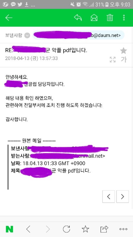 저번에 남연갤에서 피뎊따고 바로 회사한테 메일보냈는데 답장왔다 pdf따서 보낸건 첨인데 답장도 해주는구나 제발 경찰서가자 악플러들아