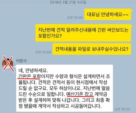 아..그리구 3400견적에 처음에는 후드와 간판포함이라고 카톡으로 대답해놓고 견적서에는 빠져있어서 물어봤더니 후드는 주인집이랑 얘기를 해봐야 한다고 하고 간판은 포함시키면 많은 부분을 포기해야 한다고 하더라구요.
