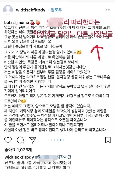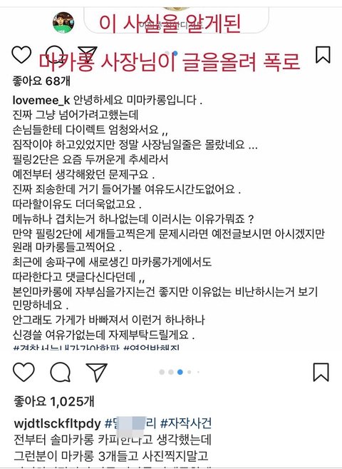 우연히 인스타에서 보게되어 가져왔어요....완전 무섭지않나요;;;;;;???????? 꼭 이렇게까지 해가며 장사를 해야하는건지;; 가만히있다가 머리채잡힌 다른 사장님들은 무슨 죄인가요? 용인에서 유명한 마카롱집이라던데 갈일도없지만 우연히라도 들어가기싫네요. 무엇보다도 피해의식 , 피해망상증이 심각해보여요ㅠㅠ