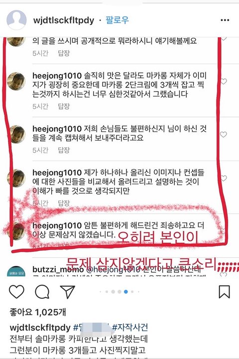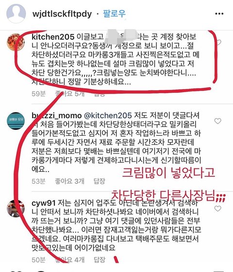 + "(그 마카롱집) 인성" 이라고 검색해보니 인스타에 마카롱이 딱딱하다고 했던 손님한테 "마카롱은 원래 숙성시켜서 먹어야해요, 안내를 제대로 못보셨나보네요~" 라고 한 뒤 바로 그 손님을 차단해버리는(?!)사건도 있었네요ㅋㅋㅋ알면 알수록 대단한것같음 (마지막 사진)