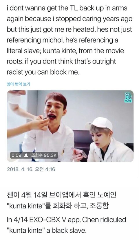 4월14일에 V라이브에서 엑소 첸이 입술을 두껍게 칠하는 벌칙을 받으면서 이거 쿤타킨테 아니냐는 발언을 해서 해외팬들이 들고 일어남