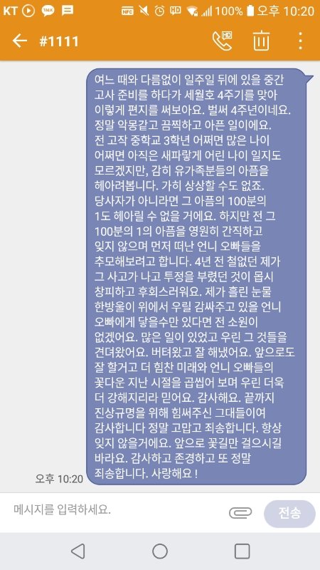 꼭봐주세요 !! 세월호 4주기를 맞아 문자로 유가족 분들께 편지 보내는 행사가 있습니다 문자는 무료이며 #1111 로 보내면 됩니다 오늘 까지에요 우리 한 줄이라도 위로와 감사의 편지를 보내요 :)