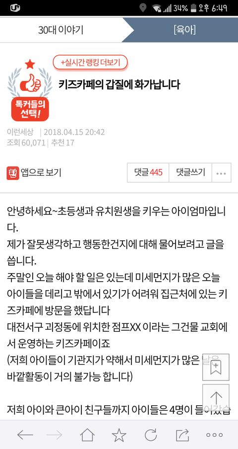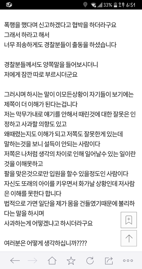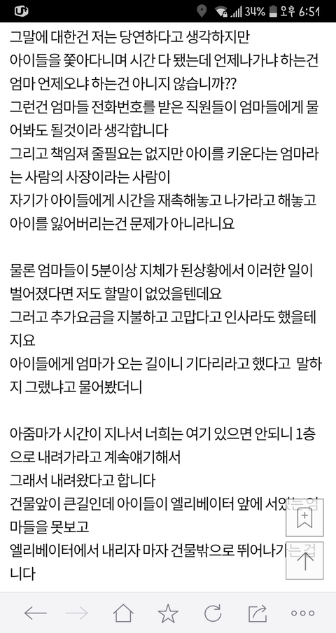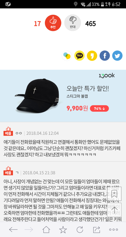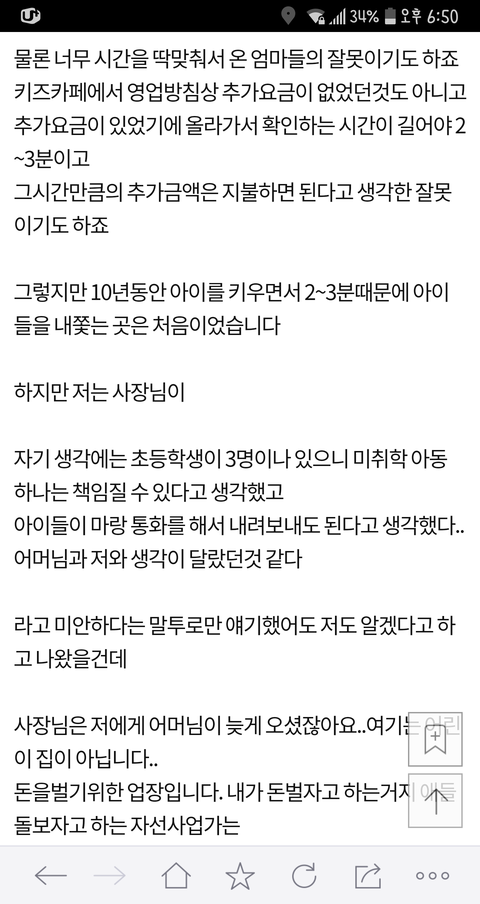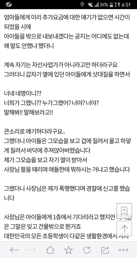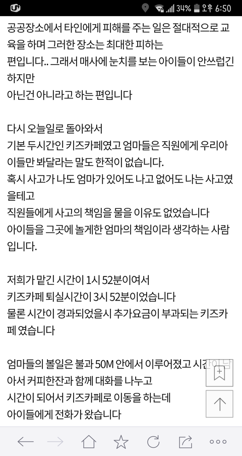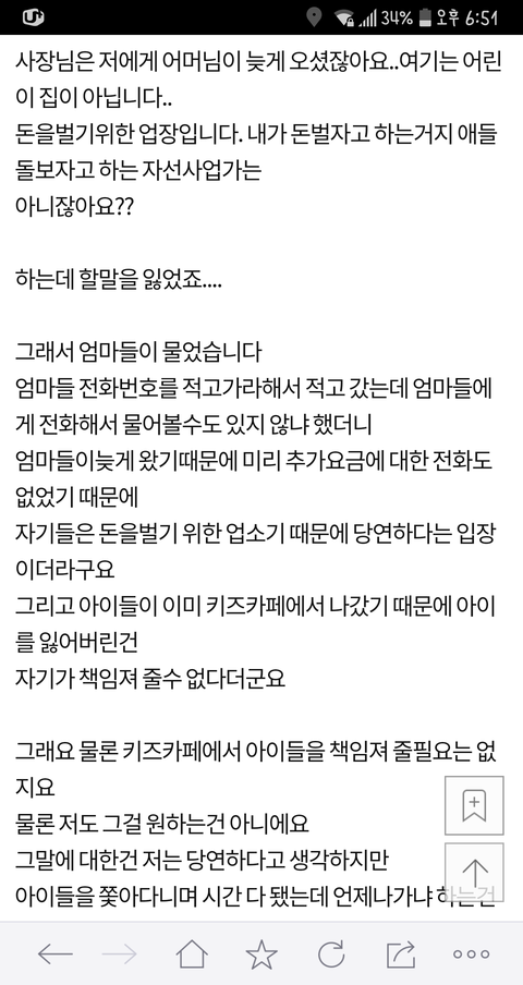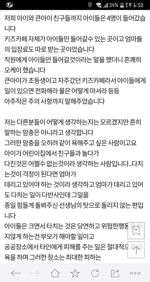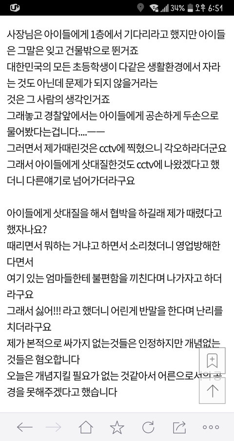 이 글 사건의 현장 목격자 증인 몇분들이 댓글 쓰셨는데... 이 글이 너무 어처구니가 없어서 댓글을 달았다고 하셨어요 목격자 분들께서 말하는 이야기인즉슨 이 사건 내용은 카페주인은 아이들에게 삿대질한적도 전혀 없고 이 글 쓴 저 애엄마가 나이많은 카페주인에게 욕설에 반말에 폭력도 아주 상당히 심하게 했고 심지어 알바생 핸드폰 까지 집어 던져서 망가트렸다고 합니다 목격하셨던 증인 글이 한두명이 아니었습니다 그 내용을 보고 몇분들이 카페주인에게 자료를 보내드렸고 카페주인도 너무 어처구니 없어서 글까지 쓰셨습니다. 사실이 밝혀지니까 글을 지운것 같고요 경찰까지 와서 폭행사실을 확인까지 했었다니까 뭐... 허위였다면 당연히 처벌 받겠죠 ^^