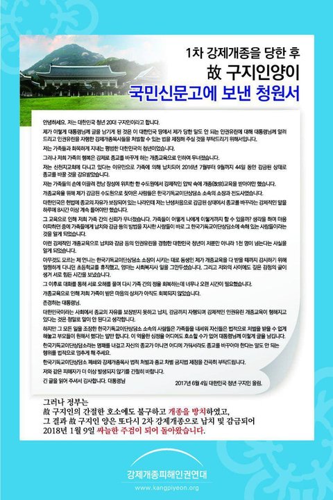 우리에게 큰 교훈을 남겨준 고 구지인양의 죽음이 헛되지 않고강제개종금지법이 제정이 되어더 이상 이와같은 끔찍한 일을 막을 수 있다면하늘에 있는 구지인 양도억울한 마음이 조금이나마 위로가 될거라 생각합니다.