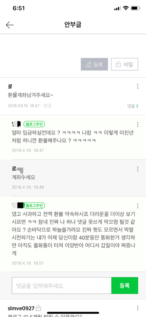 계속되는 빛삭제 하시고 그리고 제 블로그에 와서 안부글에 환불계좌달래요 ㅋㅋㅋㅋㅋㅋ