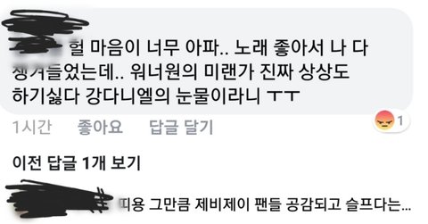 오늘 JBJ 막콘을 끝으로 활동끝으로 알고있고(아니면 미안) 그래서 *이스북에 어제 콘서트에 눈물흘린 권현빈.jpg 라고 올라온 글이 있었는데 거기서 몇몇 워너블들이 워너원 해체하면 ~~가 울겠지ㅜㅜ 라는 식으로 댓글을 달았어 이건 좀 너무 한거같아서 올릴게