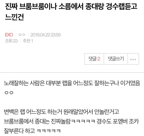 래퍼들보면 가끔 아예 노래조카잘하는 사람도 있기도 하고 그냥 유명한래퍼들 다들 노래 어느정도 하더라 ㅇㅇ 음악하는 사람들이 박자감이나 그런게 선천적으로 좋아서 그런거같기도함