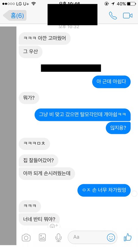 나: 오 나랑 같네 씌워다 줄게 그대신 내가 가는곳 까지만이양 !!!!!