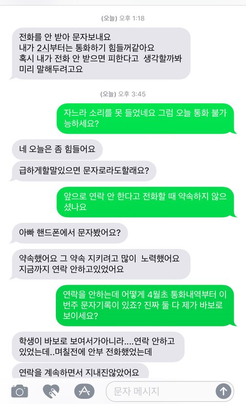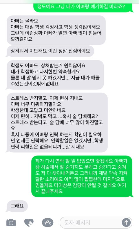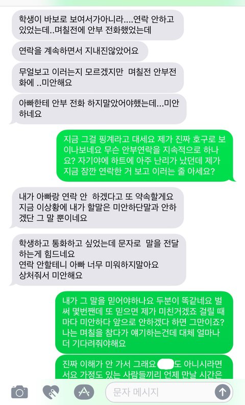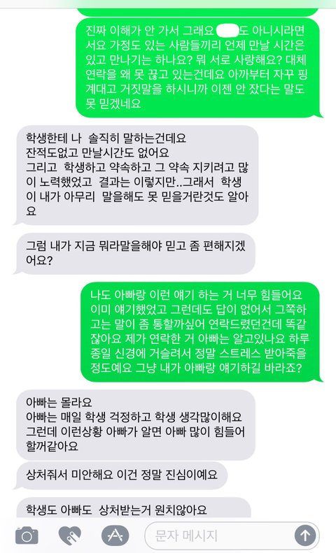 17세 여학생입니다 최대한 간단하게 설명할게요 어떻게 해야 할 지도 모르겠고 너무 답답한 심정에 글 올려요 아빠가 바람났구요 언제부터인지는 정확하게 몰라요 제가 의심을 시작한 게 작년 봄에서 여름으로 넘어갈 쯤이고 그럼 아마 그 전부터겠지요 꽤 됐어요 엄마는 몰라요 전혀... 저 혼자만 아는 사실입니다 한두개가 아니라 걸리게 된 이유나 이전 일들은 생략할게요 지금은 그저 다른 분들의 말을 들어보고 싶어요 첨부한 사진은 그 여자랑 저랑 어제오늘 주고받은 메시지고 그래도 제가 한참 어린데 너무 예의없이 말했나요 두달전에 이미 아빠랑은 대화해봤었고 아빠가 저한테 미안하다고 다시는 안그러겠다 약속했었는데 또 걸렸어요 그 때 얘기 꺼내는 것도 너무 힘들었고요 안되겠다 싶어서 그 여자분한테 전화를 걸었고 한달전에 12분가량 통화했었구요 통화 초반에 발뺌하더니 당당하고 싸가지없게 말씀 하시더라고요 거의 반강제로 여자분한테도 그만 정리하겠다 약속 받았었는데 저번주에 제가 또 봐버렸네요 한가지 말씀 드리자면 제가 아빠폰을 일부러 뒤져서 본 게 아니고 가끔 폰을 빌려쓰는데 어쩌다보니 보게 된 거구요 그 전에도 마찬가지예요 아 그리고 한달전 통화할 때 제가 아빠랑 잤냐고 물어봤거든요 근데 그 여자가 오초정도 아무 말 안하다가 그게 왜 궁금하냐고.. 그래서 대답은 할 수 있지 않냐하니 아니라고 했는데 정말일까요 이 분 어디 사는 분인지도 파악 안 된 상태입니다... 믿어도 될 지 모르겠어요 정말 앞으로 연락 안할까요? 저희 아빠도요 괜히 엄마보면 내가 미안하고 답답해서 미칠 것 같고 이제는 제가 상관할 일이 아닌데 별 것도 아닌데 괜한 오지랖인지 헷갈려요 저만 가만히 있으면 저희 가족 아무 문제 없는데 오바하는 걸까요 급하게 간추려 쓰는 중이라 글이 두서없어도 이해 부탁드려요 중간에 가려져 있는 부분은 제가 살고 있는 지역입니다 통화할 당시 같은 지역분이 아니라고 들었는데 사실여부는 모르고 정말 잠자리가 아니라면 둘이 연락하는 이유를 도무지 모르겠어요...