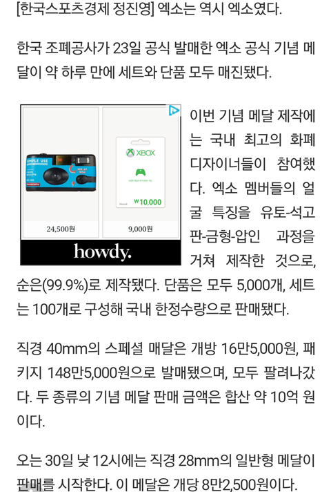 엑소 메달 하루만에 완판 판매금액 10억원이상