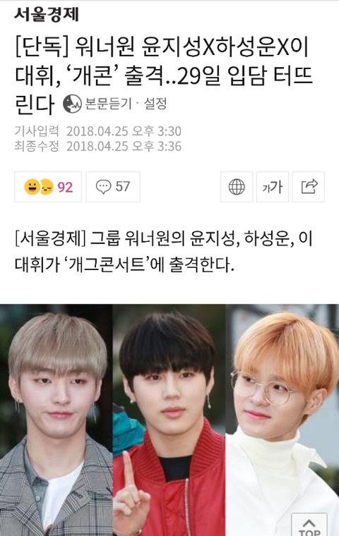 기사)워너원 윤지성X하성운X이대휘, ‘개/콘’ 출격