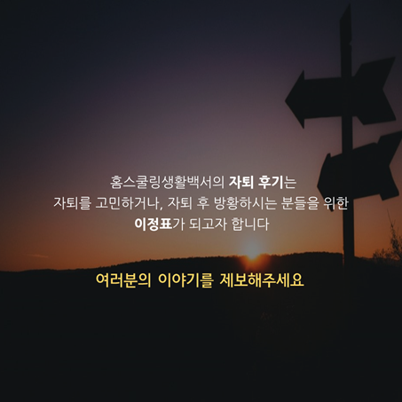 이 글은 홈스쿨링생활백서로 본인의 자퇴 후기를 보내준 주인공 분의 이야기를 바탕으로 작성되었습니다. 홈스쿨링생활백서는 36만 학교 밖 청소년들이 행복해지는 사회를 만들고자 검정고시 및 입시와 같은 학교 밖 생활 필요정보를 제공하거나 자퇴생들간의 친목을 위한 모임을 주최하고 있는 비영리 단체입니다. 자퇴에 대해 궁금한 것들이 있다면 언제든지 홈스쿨링생활백서로 연락주세요.