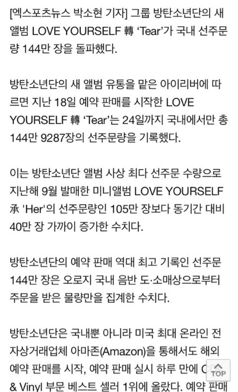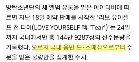 방탄 선 주문량 144만장 돌파함ㅋㅋㅋㅋ이것도 국내음반만 집계된거라는데 진짜 대단한듯 레알 어그로들의 말은 거꾸로이뤄지는게 맞는가봄...레알 어나더레벨이다