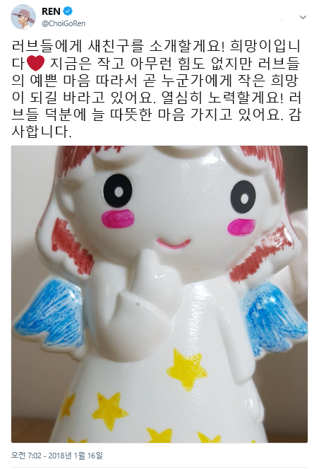 근데 렌이 팬들이 기부한거보고 소아암재단(팬들이 기부한 단체)에서 저금통을 받아서 그걸 희망이란 이름을 지어주고 트위터로 올렸어