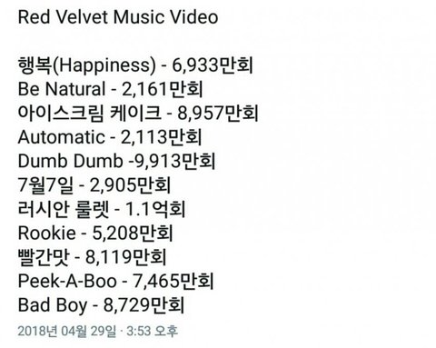 레드벨벳 뮤직비디오 조회수 정리