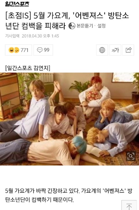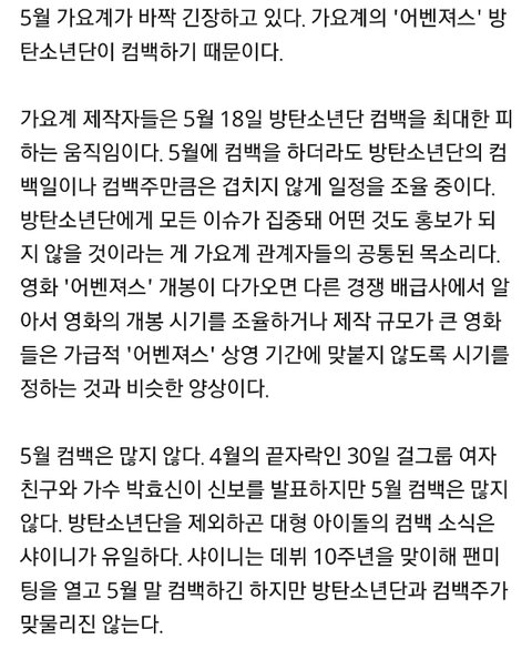 근데 피할수밖에 없는게 성적도 성적이지만.. 이번컴백을 국내음악방송사가 아니라 무려 빌보드뮤직어워드에서 최초공개하는거라 화제성에서도 방탄에게 쏠릴수밖에 없는상황이라 타격 덜받으려면 안겹치게 하는게 좋을듯..