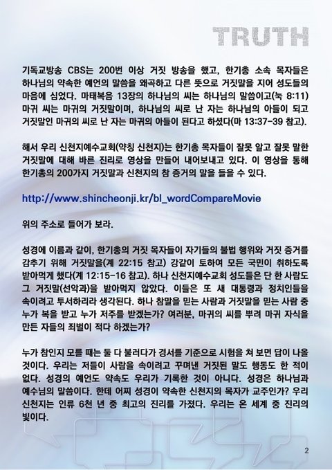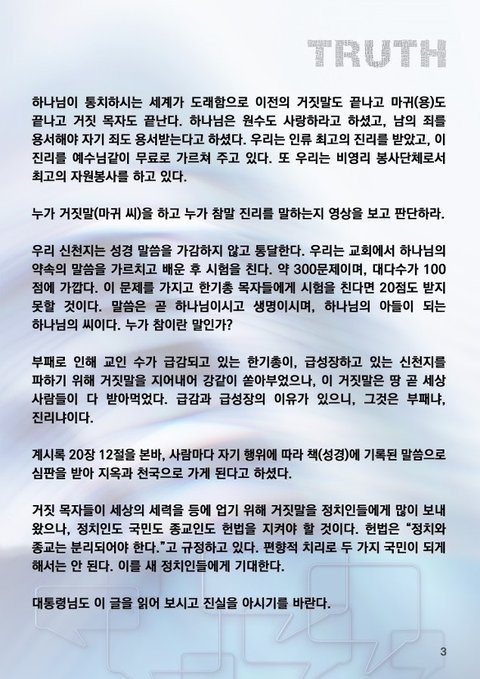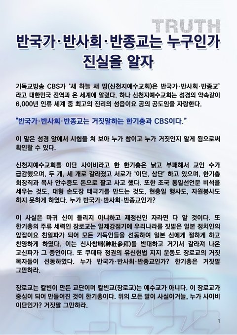 근거 없는 말로 신천지를 반국가, 반사회, 반종교라고 합니다