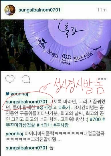여자친구와 성시경 콘서트를 다녀온 뒤 인스타 아이디를 성시경 시ㅣ발놈이라 바꿈.