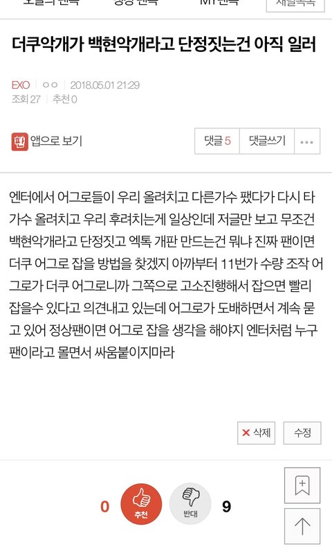 ㅋㅋㅌㅋㅋ근데 악개냔 타멤 ㅈㄴ뚜까패고 백현이 칭찬글올리는거