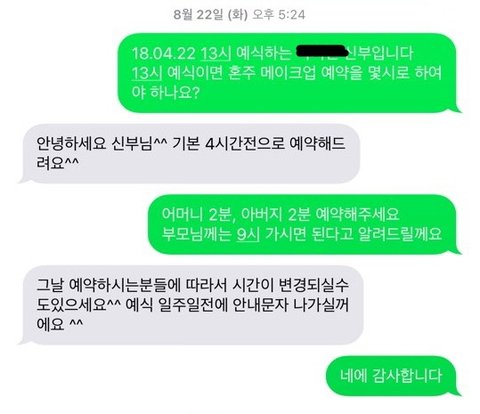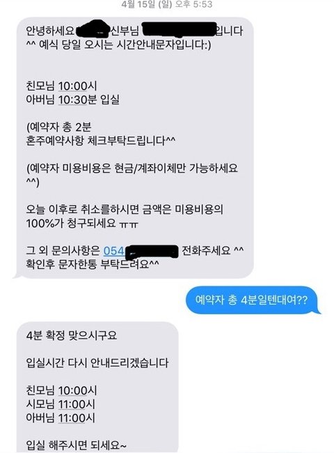 예식 1주일전인 18년 4월 15일에 뷰티실에서 온 문자에는 2분으로 예약이 되어있네요
