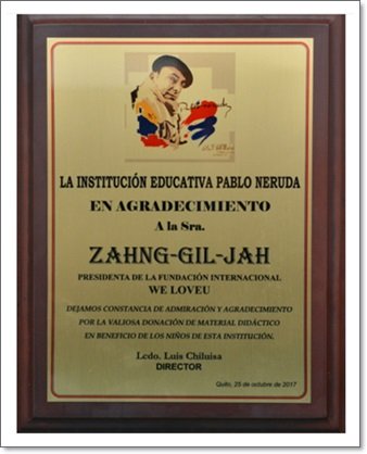 에콰도르 파블로 네루다 초등학교에서 감사패를 보내왔습니다.