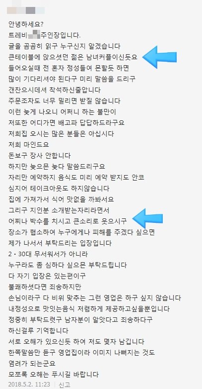 사장님게서 저희 테이블에 오더니 조용히해달라고 ..