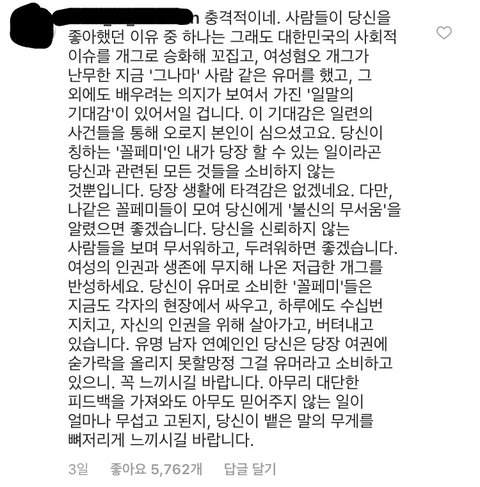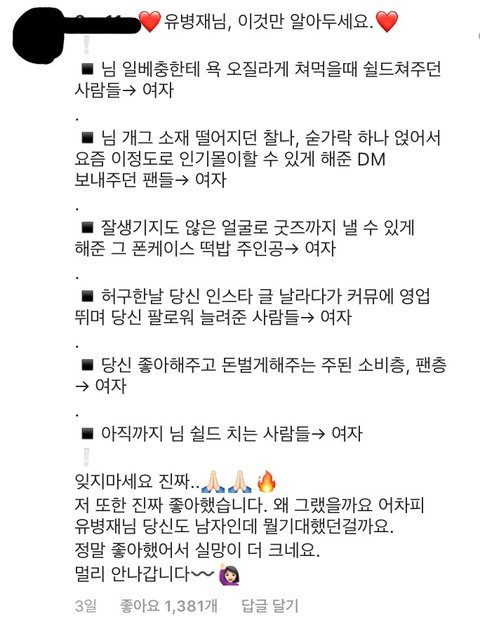 유병재가 여성인권에 관심이 많고, 배우려는 의지가 있어보여서 페미들은 꾸준히 유병재 지지했고 케이스 팔아주고 착즙해가면서 덕질해줌 ㅋㅋㅋㅋㅋ
