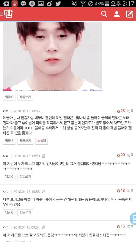 안녕하세요 유니버스님들 !! 저 같은 큡라 비투비 파는 멜로디인데 잠시 팬톡에 글쓰러 왔어요 ,,, ㅎㅅㅎ 이때가 펜타곤 분들 역주행 하기 전인데 비투비 후배라서 노래 항상 들어왔었거든요 근데 Like this 때부터 후이님이 타이틀 작곡하신 걸로 아는데 너무 좋아서 본격적인 관심을 조금씩 갖게 됐어요 어쩔 수 없는 큐브의 노예 ,, 근데 왜 안뜨나 항상 이해가 안가서 안타까워가지고 이번 노래도 넘 좋길래 판에 저렇게 댓 썼었는데, 지금 역주행 하고 뜬거 보니까 넘 기분 좋아요 ㅜㅜㅜ 펜타곤 실력있는 그룹이니까 꼭 성공할거에요 :) 큡라끼리 친하게 지내용 희희