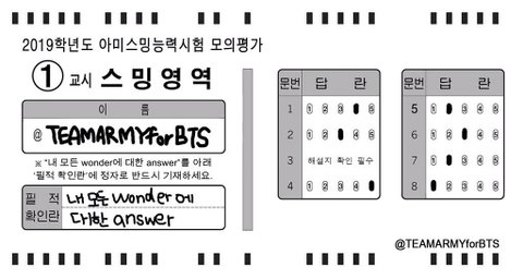저는... 마지막 문제를 틀려부렀습니다......ㅎㅎ 난 걍 아미들만 믿고 가니까!! 돌리라면 돌리라는대로!! 한건데!! ㅋㅋㅋㅋㅋ 정규라서 돌리는건줄 알았다고 함미다.. 나름 잘한다고 생각했는데 더 노력해야겠다고 생각하게 되어씀니다.