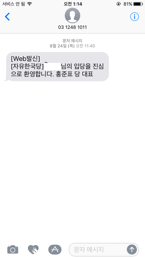 17년 8월 24일 제 핸드폰에 문자한통이 왔습니다. 자유한국당 당원에 가입하신걸 축하한다는 내용이었습니다. 처음엔 스팸문자인줄 알고 넘겼습니다.