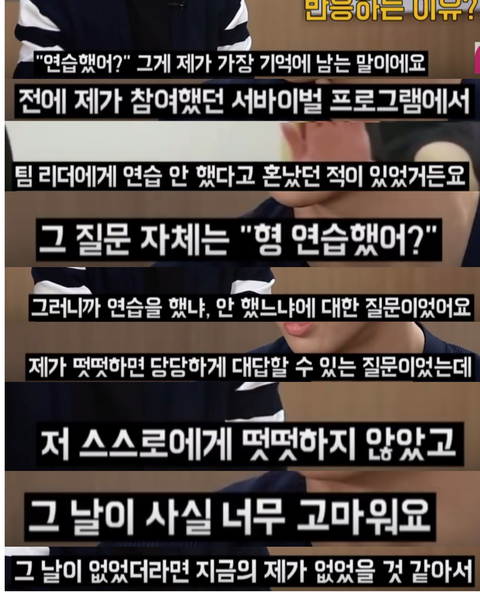 1. 톡선에 연습했어???라고 멤버들이 물어보는 장면 모든 멤버들 데뷔하기 전에 엠넷 프로그램에서 만든 펜타곤 서바이벌 리얼리티 프로그램에서 나온 장면이야 https://youtu.be/00UaYbyhX9o 여기 풀영상 있으니까 보고와도 돼 처음부터 끝까지 다 연출로 이뤄진 장면이고 멤버들 한 명 한 명 각 클립에서 소개시켜주는 장면이야 이 상황에서 타의적으로 연출이 이뤄진거고 끝까지보면 사실 아이콘한테 고맙다고 하는 장면이야