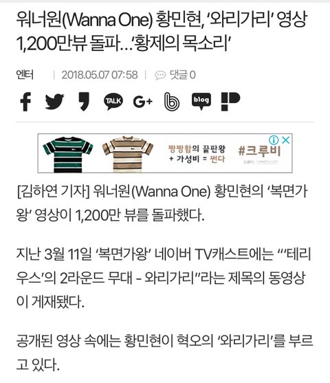 기사)황민현, ‘와리가리’ 영상 1,200만뷰 돌파…‘황제의 목소리’