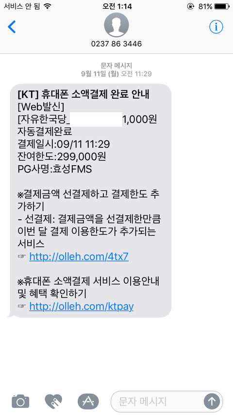 17년 9월11일 다시 제 핸드폰으로 자유한국당 당비납부명목으로 1000원이 소액결제 되었다는 알림문자가 왔습니다. 실제로 휴대폰 요금으로 1000원이 청구되었고 납부가 된 사실을 알게 된후 진상파악에 나섰습니다.