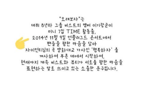 *라이트 팬덤은 빅스 멤버가 먼저 사용했음에도 불구하고, 자신들이 '먼저 공식문구로 지정했음'을 이유로 들며 지속적으로 빅스 멤버 레오군을 사이버불링을 해 왔습니다. 따라서 저희가 그 이전부터 '오래보자'를 사용해 왔다고 명시한 점 양해 부탁드립니다.