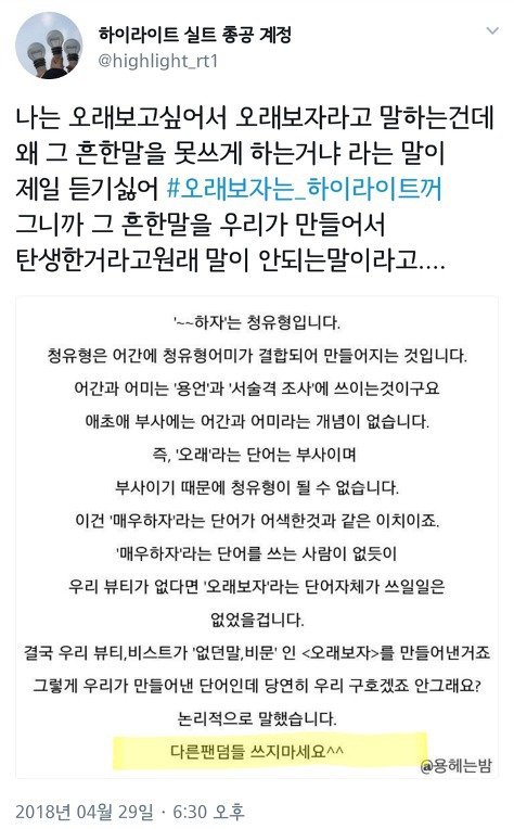 그러나 팬덤 라이트에서는 그 부분마저 사용하지 말라며, 빅스 레오군에게 지속적인 직멘과 악의적 트윗을 올렸습니다. 그러나, "오래보자"는 누구에게나, 언제든지 내 마음을 소중한 사람에게 전하고 싶을 때 사용할 수 있다고 생각합니다.