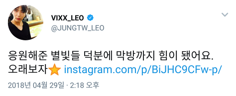 4/29 빅스 멤버 레오군이 막방 기념 인스타그램(SNS)에서 오래보자라고 사용하자