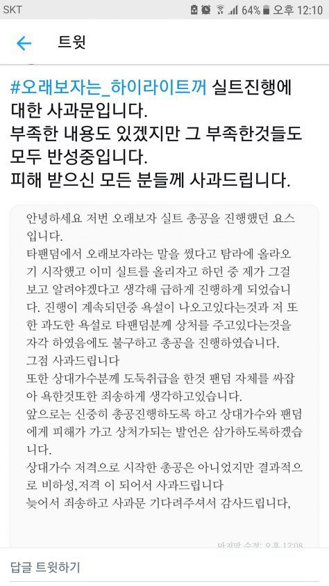 또한 하이라이트 팬덤 라이트 총공계정에서 사과를 해왔지만