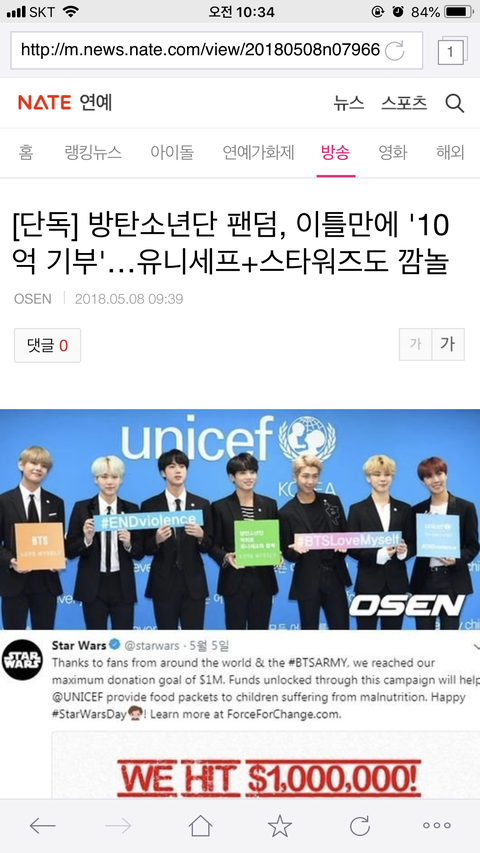 네이T, 네1이버 단독 유니셒 아미 10억기부 기사