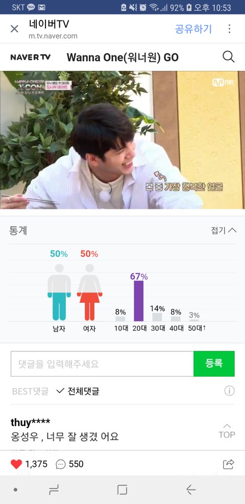 옹성우 남자들한테도 인기많은 멤버인건 알고 있었는데 남녀성비 저러는거 첨 봐서 ㄷㄷㄷ