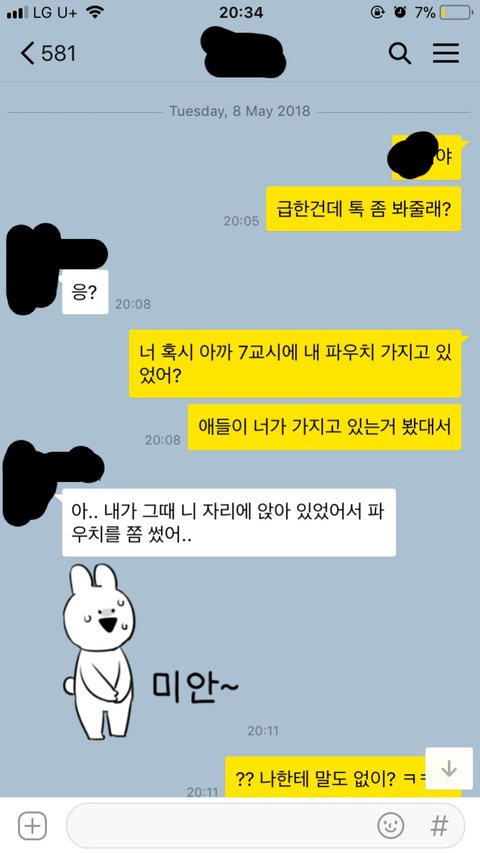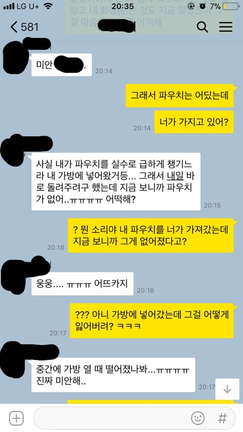내가 그래서 파우치 어딨냐니까 그제서야 없어졌다고 한 거는 내가 톡 안했으면 그냥 말 안했을거란 거잖아 ㅋㅋㅋㅋ