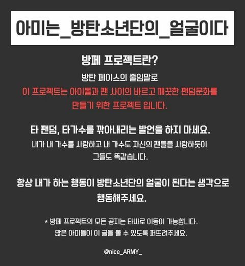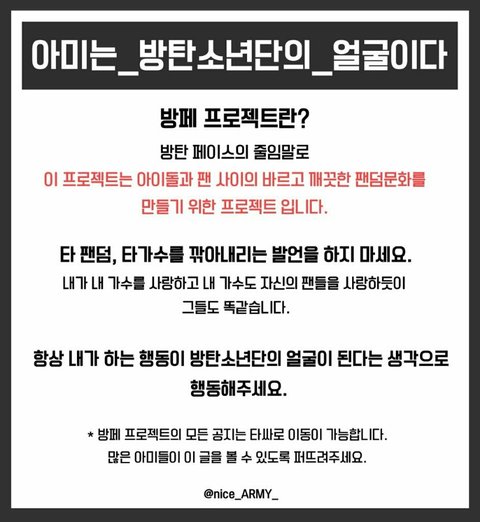 요즘 ㅇㅌ에 아미들로 보이는 댓글중에 욕 쓴거 많더라.. 보면 다들 주의 댓글 (이쁘게) 남겨주고 댓주인은 기분 나빠하지 말고 (빠른 피드백 중요)