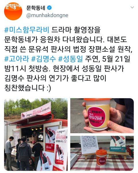 어젠가 출판사에서 드라마 촬영장 커피차 서폿 드간거 알았었는데 출판사에서도 서포트 하는구나 신기하면서도 묭이 왠지 좋은 환경에서 촬영하는거 같아 좋았었는데 서폿 후기에 한세상 판사님이 묭 판사연기 칭찬했다니 너무좋아ㅜㅜ