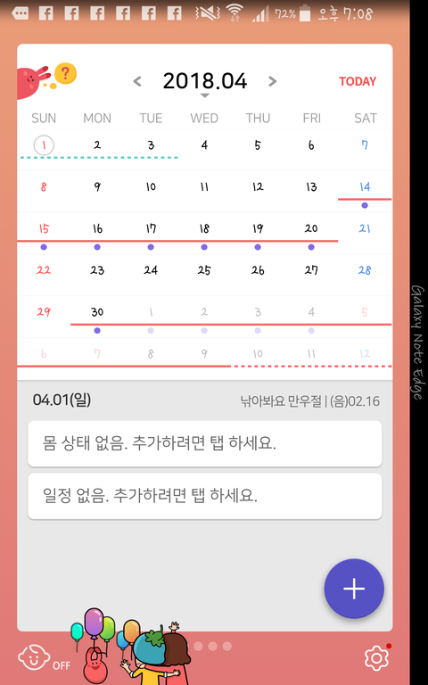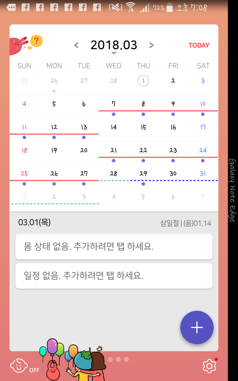 달력은 붉은? 줄이 생리했던 기간이야 붉은 점선은 생리 예정일이구..
